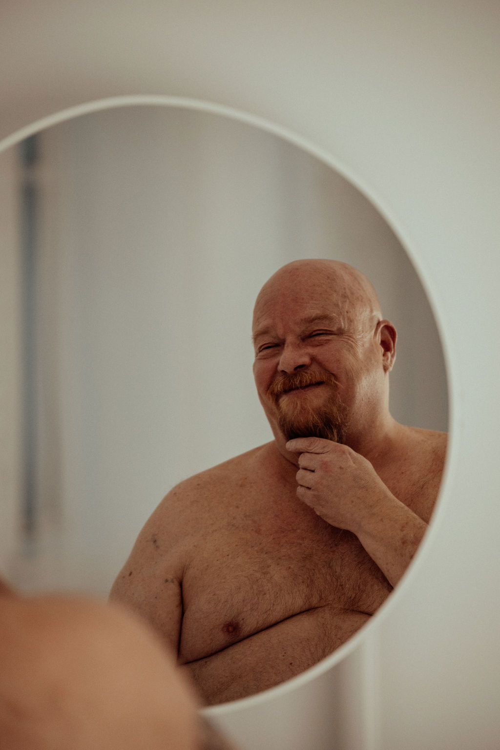64 years old, 5’6”, 255#, shaved head with reddish goatee and stache, moderate furry most places but light in color and fine.