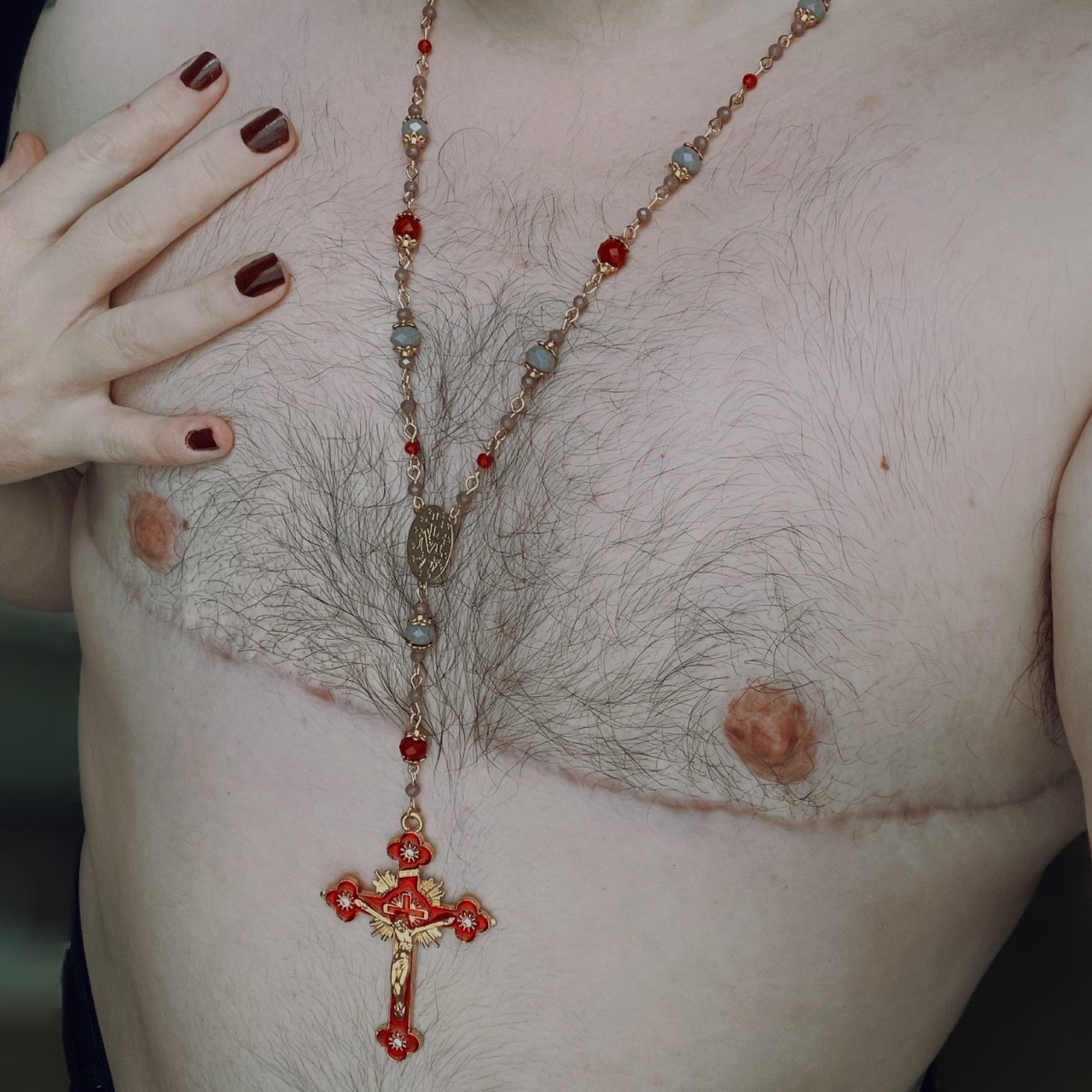 Pretty face, facial hair, long hair, hairy body, thicc and curvy. Post-top surgery. Tattooed.